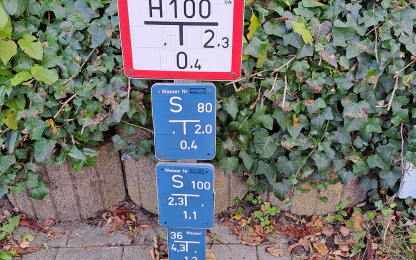 Im Rahmen der Überprüfung lernen die neuen Kameraden auch die Standorte der Hydranten kennen. Bei der Arbeit haben die Kameraden / Kameradinnen leider aber auch feststellen müssen, dass -wenn auch selten- nicht immer alle Hydranten vollständig frei zugänglich bzw. teilweise zugeparkt waren. Die Lage der Hydranten sind auf den Hydrantenschildern beschrieben und können durchaus mehrere Meter von den eigentlichen Schildern entfernt liegen (z.B. auf dem Bürgersteig, der Straße oder der Grundstückszufahrt). Foto: Wo befindet sich der Hydrant? Steht man vor dem Schild, befindet sich der Hydrant 0,4 Meter davor und 2,3 Meter rechts davon.