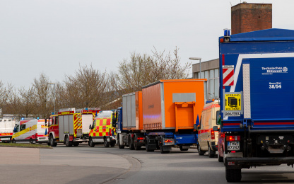 Zeitgleich traf die zweite Kolonne mit 12 Einsatzfahrzeugen in Süderbrarup ein. Auch diese wurde empfangen, eingewiesen und verließ gegen 12:15 Uhr den Bereitstellungsraum, ebenfalls mit dem Ziel, das Gelände der Landesfeuerwehrschule in Harrislee zu erreichen.