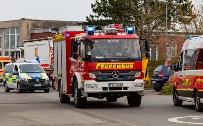 Gegen 11:00 Uhr traf die erste Kolonne mit knapp 15 Einsatzfahrzeugen in der Team Allee ein. Nach Einweisung und Anmeldung gab es eine kurze Pause, bevor es um 11:30 Uhr mit dem Ziel Landesfeuerwehrschule Harrislee weiterging.