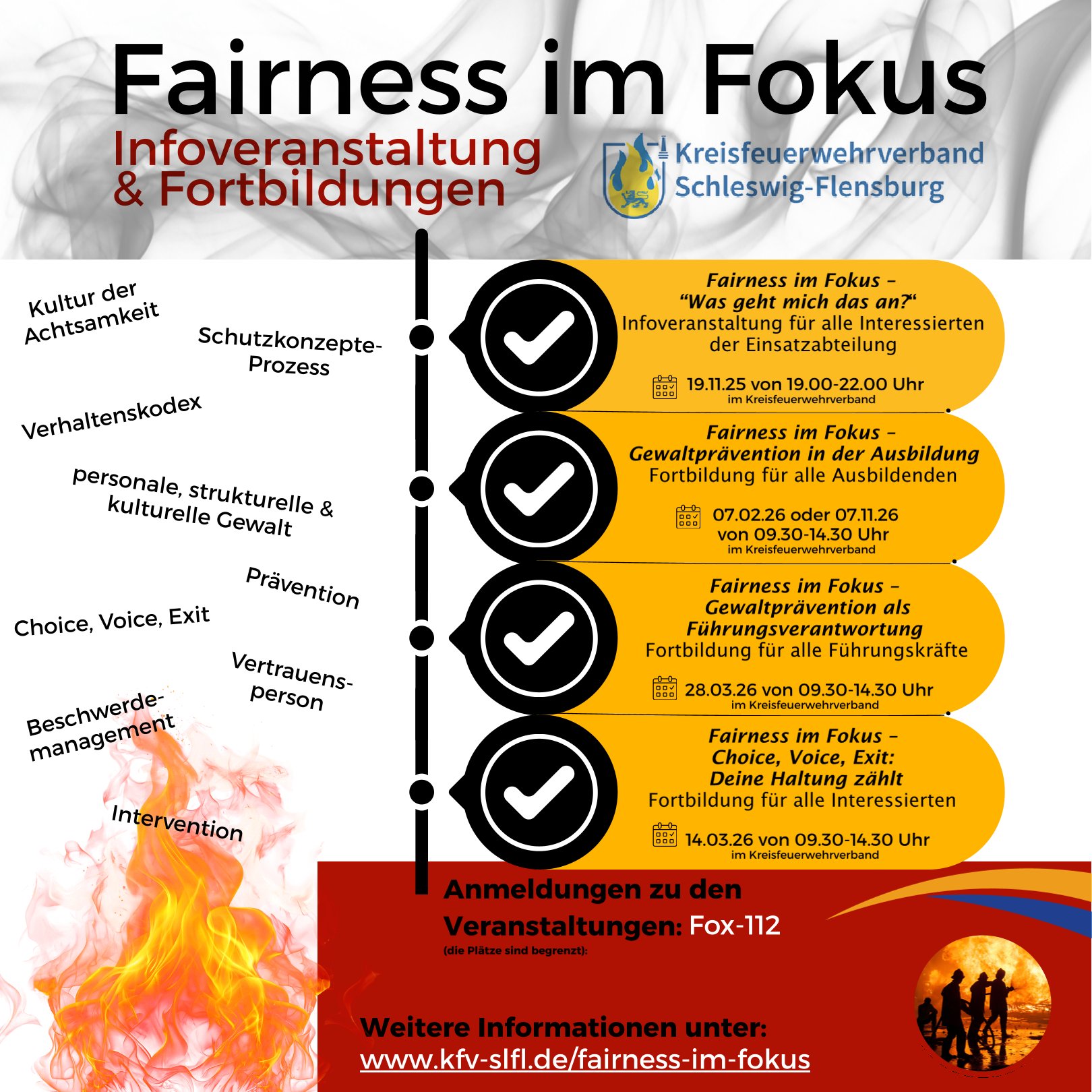 Du kannst Fortbildungen und Workshops für deine Feuerwehr anfragen – Ann-Kathrin Lorenzen erstellt dann ein passendes Angebot. Außerdem werden gezielte Schulungen sowohl für die Jugendfeuerwehr als auch für verschiedene Personen der Einsatzabteilung angeboten.