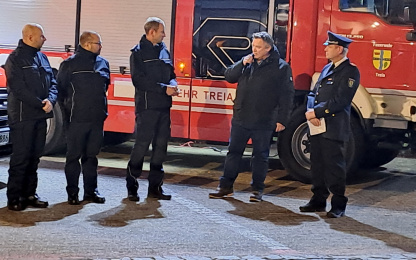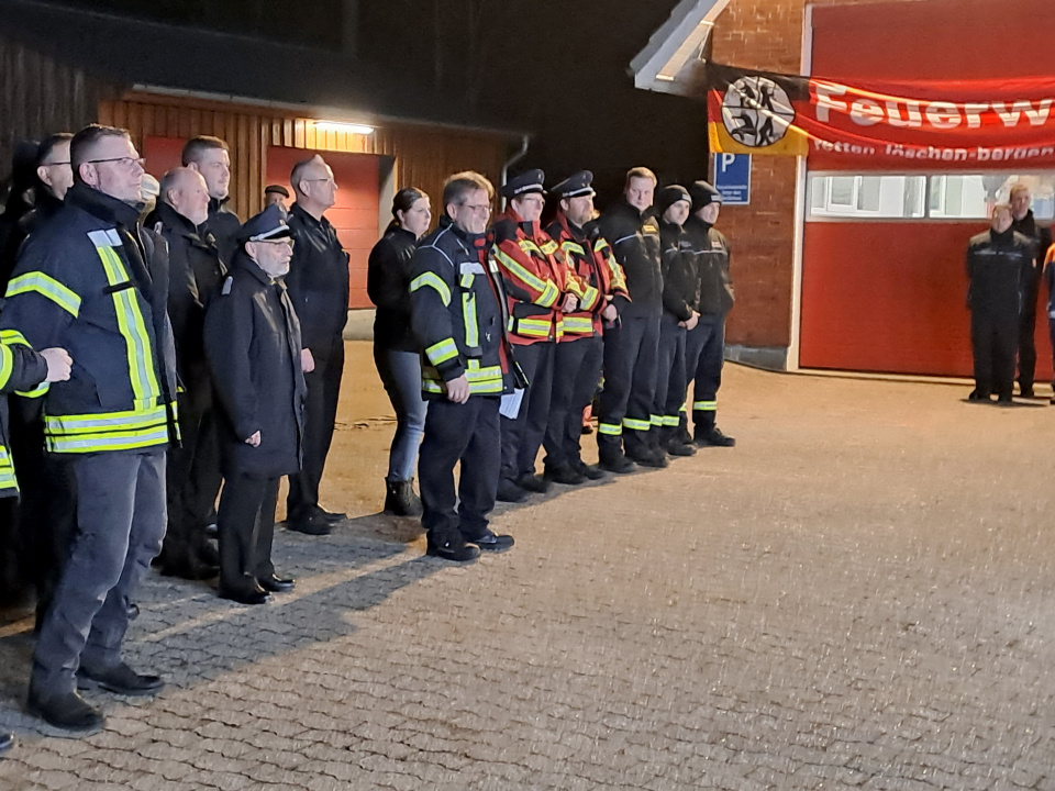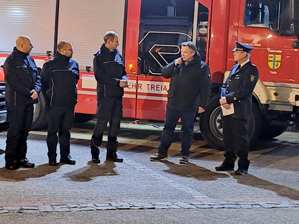 Bürgermeister Raoul Pählich griff diesen Einsatz auf, und betonte noch einmal ausdrücklich, wie Stolz die Gemeinde sein kann, dass die FFW Treia so aktiv ist. Aber auch der Einsatz der Nachbarwehren – sowohl im Amt Arensharde als auch ämter- und kreisübergreifend – zeigt den Zusammenhalt, die Einsatzbereitschaft und –fähigkeit der Wehren, wenn ein Notfall eintritt. Auch hätten viele Privatpersonen die vermisste Person mitgesucht. Dieser übergreifende Zusammenhalt ist in der heutigen Zeit enorm wichtig. Eine gute Ausrüstung der Wehr, dazu zählt auch der neue MTW, in Kombination mit motivierten Menschen dienen der Sicherheit der Gemeinde und ihrer Einwohner. Zur guten Ausrüstung zählt auch, dass das Feuerwehrgerätehaus in Treia 2026 umgebaut, erweitert und deutlich modernisiert wird.