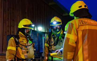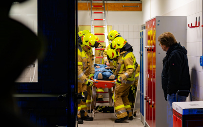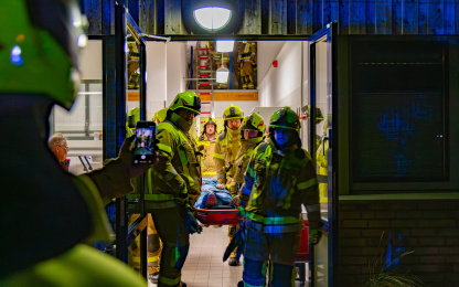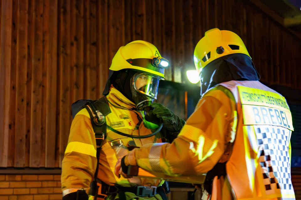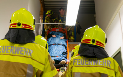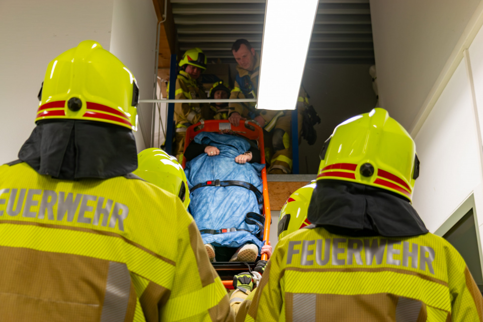 Während sich die Kameradinnen und Kameraden aus Brebel und Dollrottfeld um die Menschenrettung in Verbindung mit der Brandbekämpfung sowie um die Herstellung einer Löschwasserversorgung über lange Wegstrecken kümmerten, retteten die Einsatzkräfte aus Süderbrarup eine verletzte Person mithilfe einer Schleifkorbtrage aus einem höher gelegenen Lagerbereich. Zudem führten sie mehrere Personen, darunter einen Rollstuhlfahrer, aus dem zweiten, nicht verrauchten Gebäudeteil und übergaben diese anschließend an den simulierten Rettungsdienst.