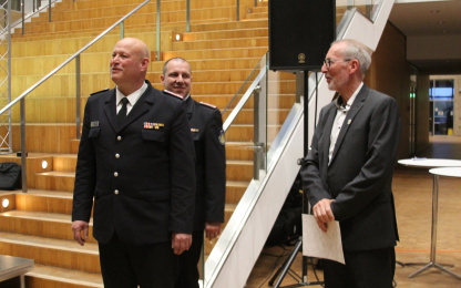 In seiner Laudatio lobten er und seine beiden Stellvertreter die sehr gute Zusammenarbeit mit dem Landrat und dessen Einstellung, dass der Schutz der Bevölkerung immer Vorrang habe und Kosten erst sekundäre Betrachtung fänden. Auch die gute Zusammenarbeit bei der Ostseesturmflut im Jahr 2023 erwähnte Rücker. Dr. Buschmann bedankte sich für diese Ehrung und brachte seine Dankbarkeit und Rührung darüber zum Ausdruck.