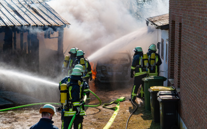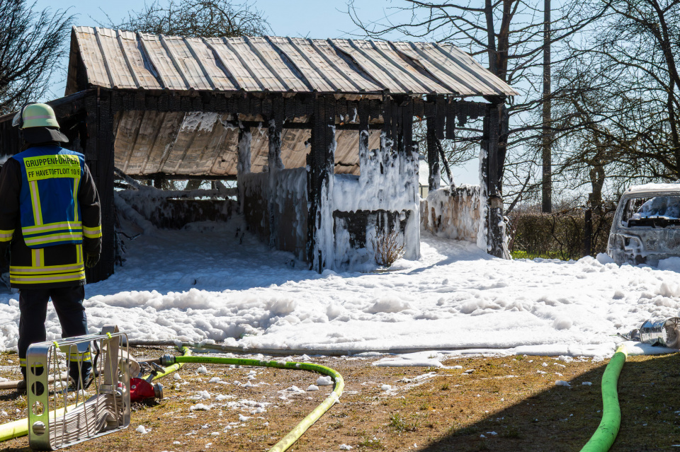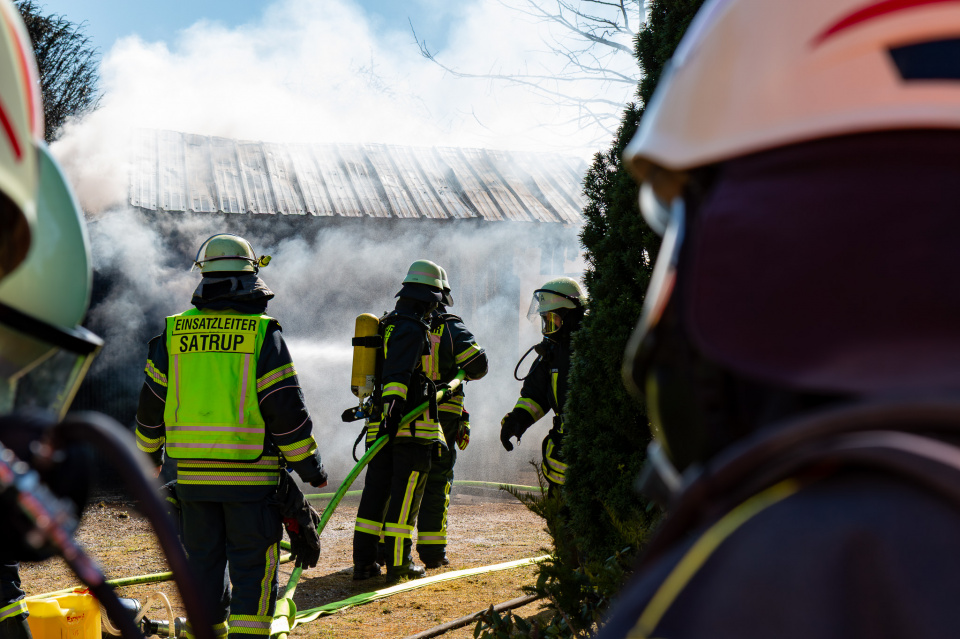 Erneut war eine große Rauchwolke für die anfahrenden Kameradinnen und Kameraden der Feuerwehren Havetoftloit, Satrup, Esmark-Rehberg, Rüde, Struxdorf und Ekeberg sichtbar. In Havetoftloit brannte um die Mittagszeit ein freistehender Schuppen mit Holzfassade und Blechdach sowie ein daneben abgestelltes Fahrzeug in voller Ausdehnung. Das Feuer drohte auf das angrenzende Wohnhaus überzugreifen.